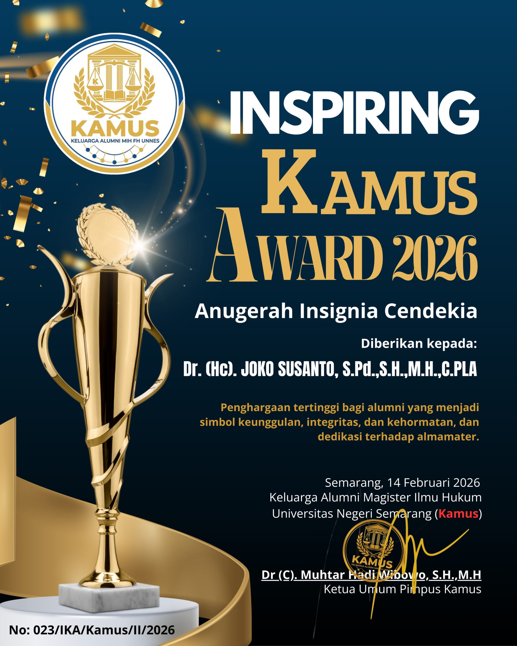 SEMARANG -Dailypost-indonesia.my.id| Agenda Reuni Akbar Lintas Angkatan Magister Ilmu Hukum Fakultas Hukum Universitas Negeri Semarang, Sabtu (14/2/2026), berlangsung khidmat sekaligus penuh apresiasi. Dalam forum tersebut, Pengurus Pimpinan Pusat Keluarga Alumni Magister Ilmu Hukum Fakultas Hukum Universitas Negeri Semarang (KAMUS) Masa Bhakti Ke-I Periode 2026–2030 menyerahkan “Inspiring Kamus Award 2026” kepada 32 alumni yang dinilai memiliki dedikasi tinggi bagi alumni dan almamater.