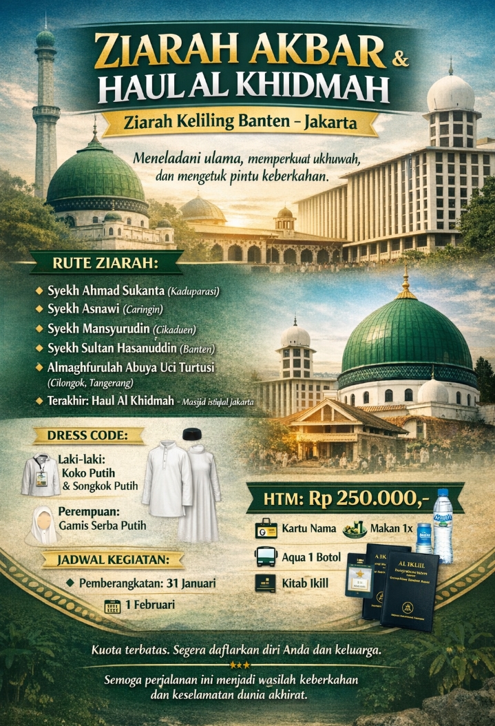 Pandeglang- Dailypost indonesia.my.id|Rombongan Pondok Pesantren At Thoriq dijadwalkan akan menggelar Ziarah Akbar dan menghadiri Haul Al Khidmah Jakarta 2026. Kegiatan ini merupakan bagian dari agenda keagamaan tahunan yang bertujuan untuk meneladani para ulama, memperkuat ukhuwah Islamiyah, serta meningkatkan spiritualitas para santri dan jamaah.
